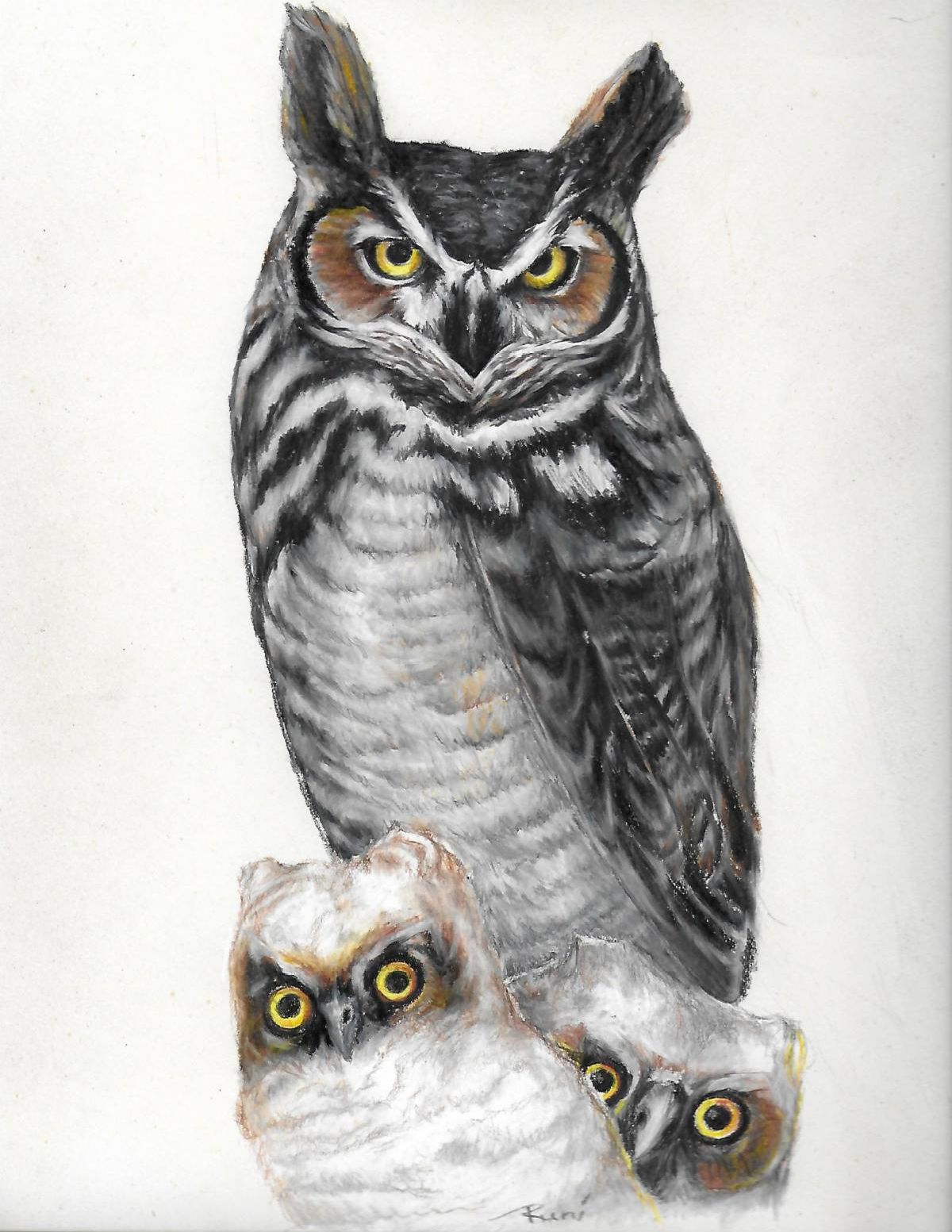 EE resident, Heidrun (RUNI) Kessler's new exhibit of over 30 bird and botanical drawings opens Jan 2, 2025 in the GVR Desert Hills Lobby and runs through Jan 31. The exhibit features this drawing of "Owls and Owlets."