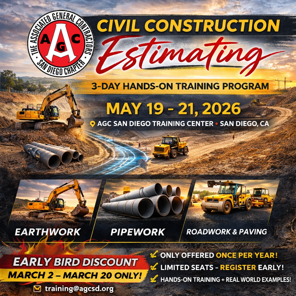 Due to industry demand, AGC San Diego is proud to announce the addition of our Civil Construction Estimating Three-Day Training Program, a comprehensive hands-on course designed to build