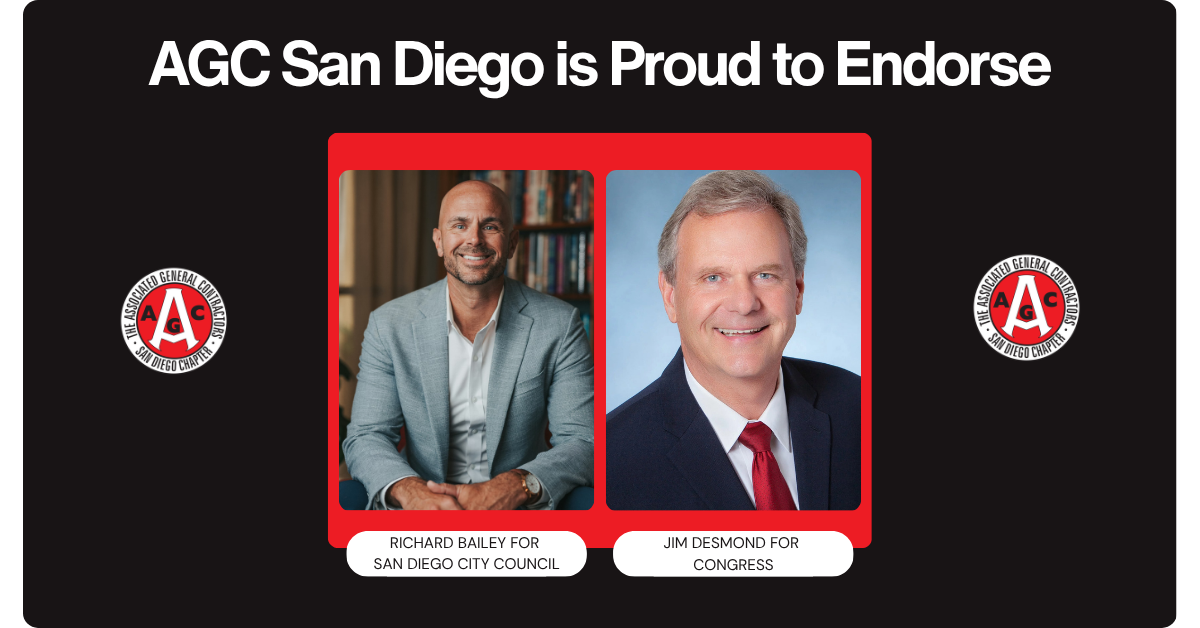 We met with four candidates: Jim Desmond (Congress, CD48), Mara Elliott (State Senate, SD40), Richard Bailey (San Diego City Council, District 2), and Ed Musgrove (State Senate, SD40). The PAC recommended endorsements of Desmond and Bailey, and, on Thursday, AGC San Diego's Board of Directors ratified those two recommendations, making them full endorsements. They join four previous endorsements: Jordan Marks for Assessor, John McCann for Mayor of Chula Vista, Mike Sannella for Mayor of San Marcos and Lindsey Smith for San Marcos Council.