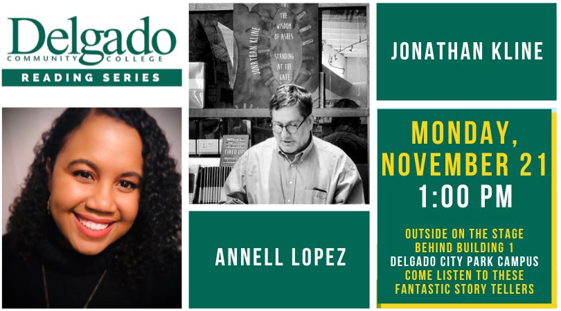 Annell López & Jonathan Kline will read their work on Monday, November 21st at 1:00 p.m. followed by a Q&A. The event will be outdoors at Delgado's City Park Campus on the stage behind building 1 in front of the mirrored wall. If there is inclement weather, we’ll move indoors to the lobby of the TKB theatre in building 1, Isaac Delgado Hall. Free snacks, drinks, and coffee provided. This event is sponsored by Poets & Writers.