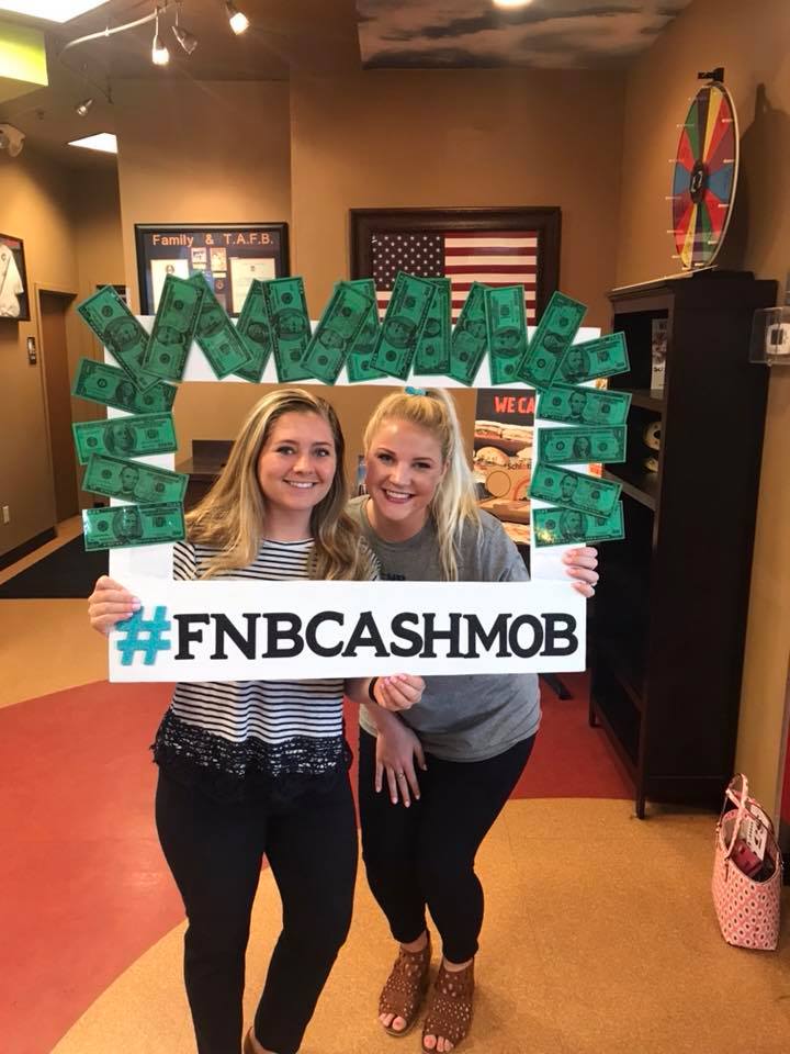A #FNBCashMob functions much like a flash mob, but instead of dancing and singing, consumers spend money as a group at a local business. Cash mobs are a fun and exciting way to shop local and spark an economic stimulus for one of our commercial customers. Helping small, local businesses thrive is one of the very reasons we, FNB Community Bank, exist.
