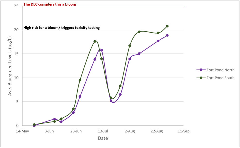 This figure shows the average blue-green algae levels in Fort Pond from May-August. This week they reached a level that will trigger toxicity testing at the Gobler Lab. Click on the figure to enlarge.