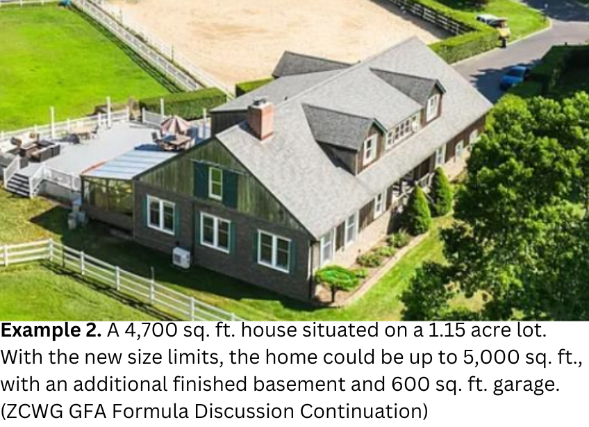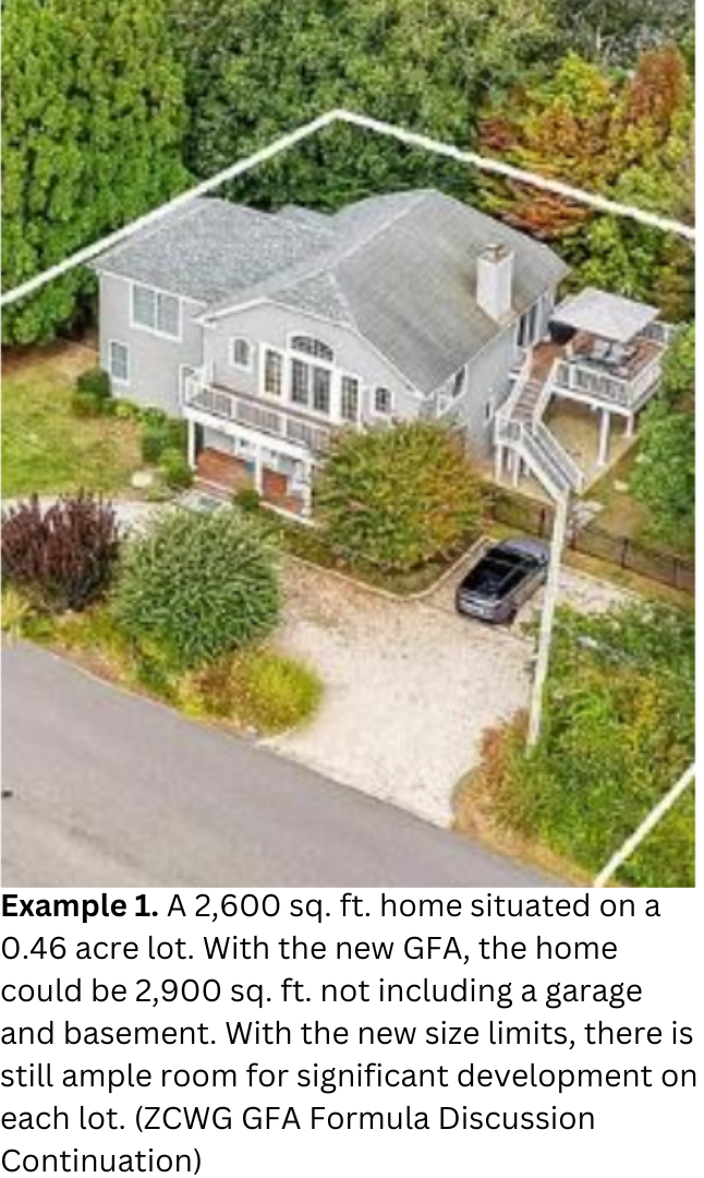 The GFA formula determines the allowable building area relative to lot size. This proposal follows an in-depth analysis by the Zoning Code Working Group (ZCWG), which evaluated environmental impacts, development trends, and alignment with the town’s comprehensive plan.