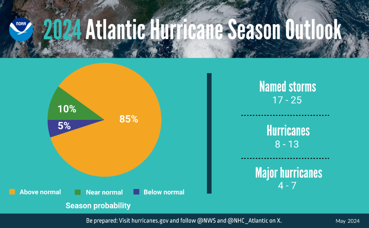 The National Oceanic and Atmospheric Administration’s (NOAA) predictions this year, updated regularly with the most recent evidence available, warned of an upcoming above-normal hurricane season. Predicted is an 85% chance of an above-normal season, meaning that for this year’s hurricane season we anticipate a total of up to 25 total named storms. Up to 13 named storms are forecast to become hurricanes, including 4 to 7 major hurricanes (category 3-5; with winds of 111 mph or higher). See this visual breakdown of hurricane categories. So far this year, we have had 5 hurricanes form in the Atlantic basin, according to the National Hurricane Center.