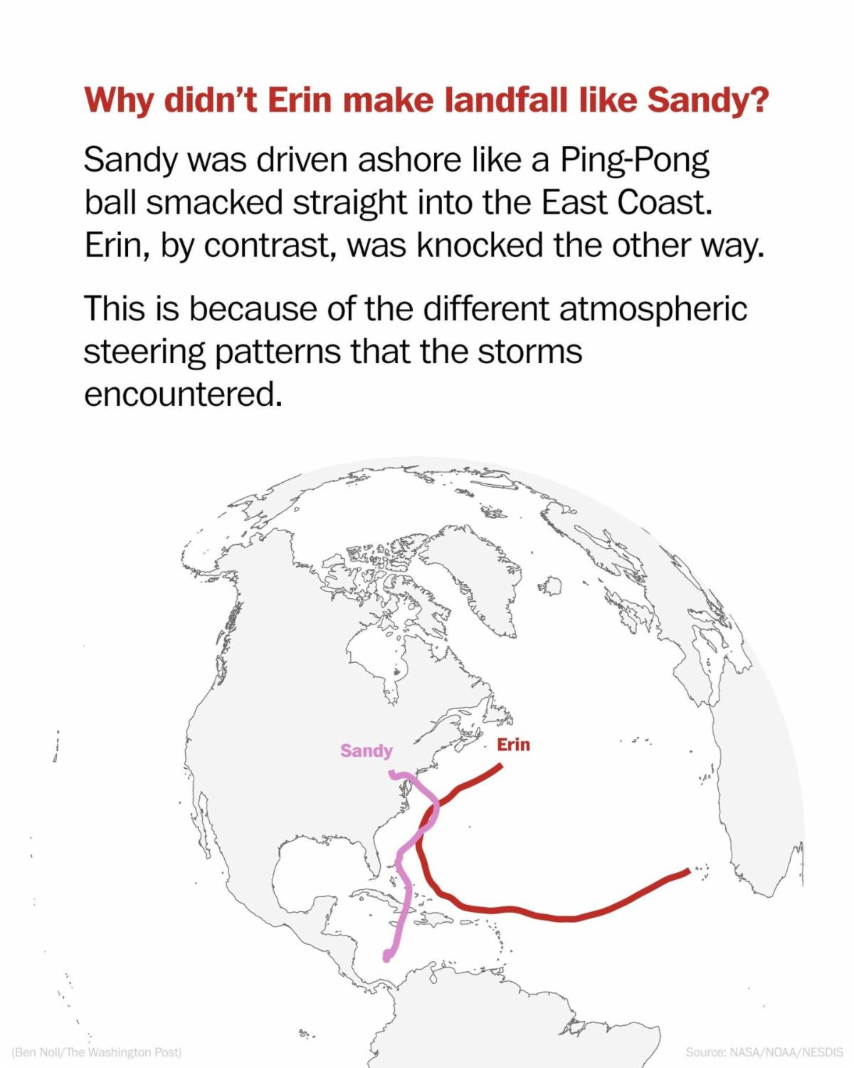 We were lucky—its track stayed just far enough offshore. This visual below shows how closely Erin mirrored Hurricane Sandy’s path, missing the East Coast by just a sliver: