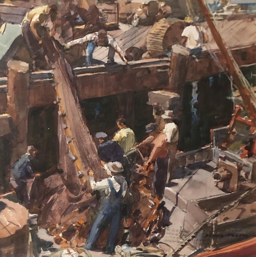 Unbeknownst to Teague at the time, the sardine industry was destined to collapse a couple years later in the 1952-53 season. The industry limped on into the 1960’s, but never regained its former stature. This little Teague watercolor is thus one of the last paintings to capture the Monterey Bay sardine industry in its heyday.