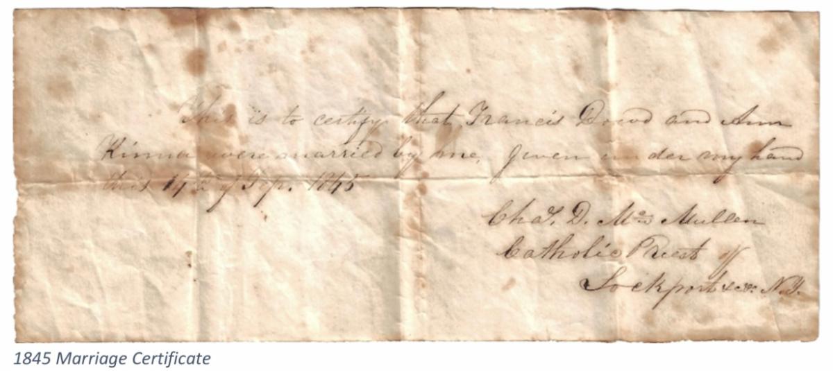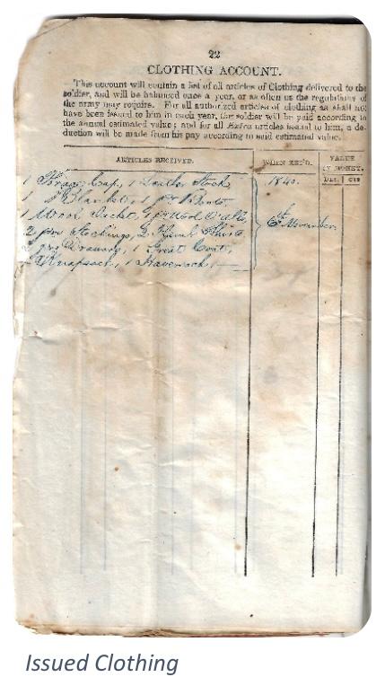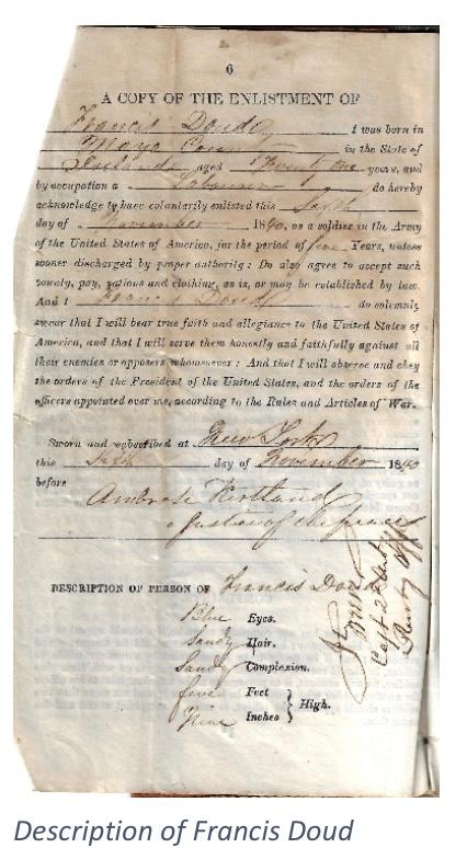 Recently, MHAA was given an extraordinary gift of personal items belonging to Francis Doud. These items include his Soldier’s Book issued to him upon enlistment in the army in 1840, a copy of his 1845 marriage certificate, and a very interesting letter from his brother written in 1863. Francis Doud served in the army during the Second Seminole war in Florida, and in the 1846 Mexican-American war; he was wounded in both wars.