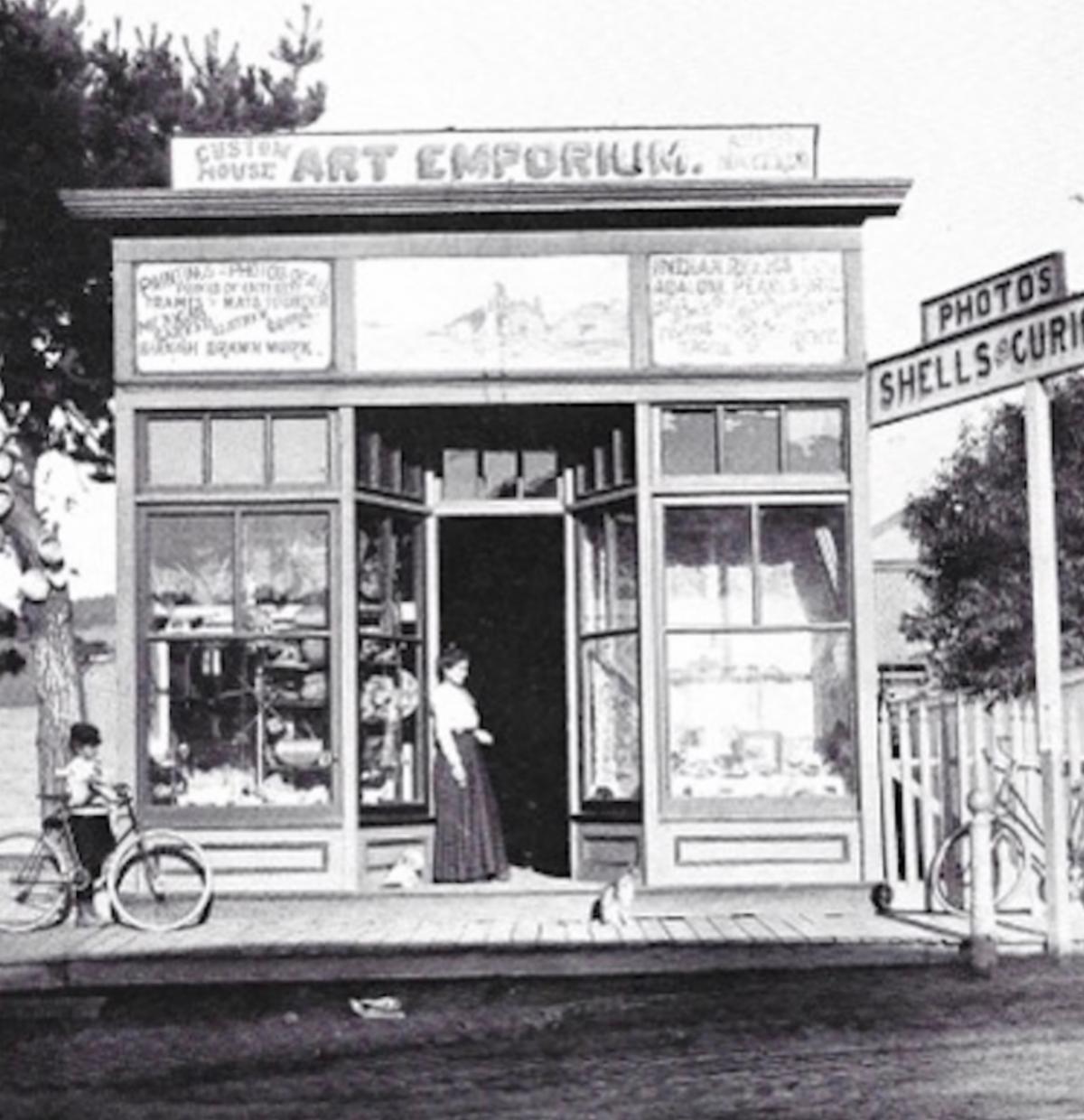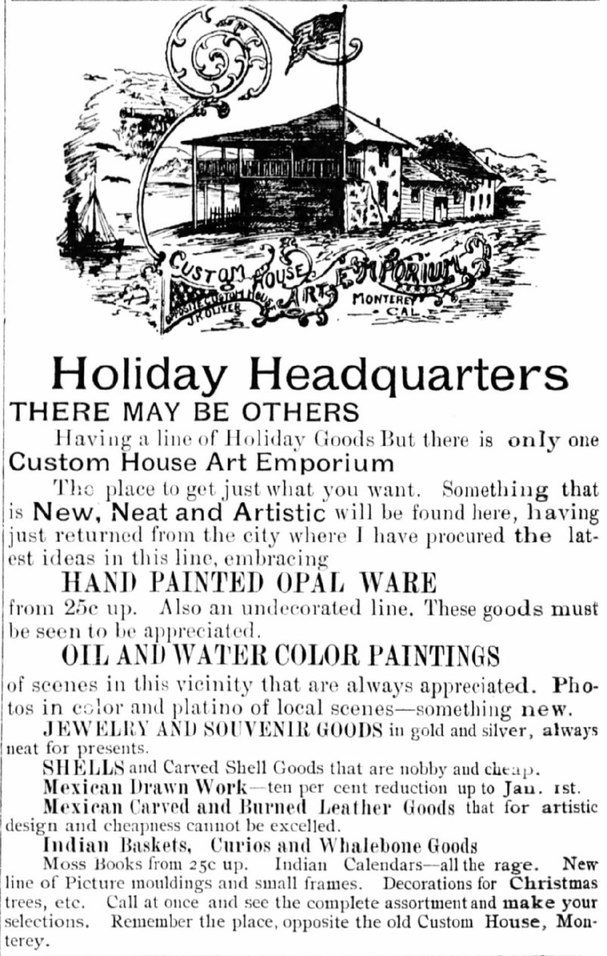 | | 1899 Oliver Custom House Art Emporium ad in the Monterey Cypress | | Myron Oliver with his mother Annie in front of the Custom House Art Emporium 106 Main (photo credit Oliver family) | | |