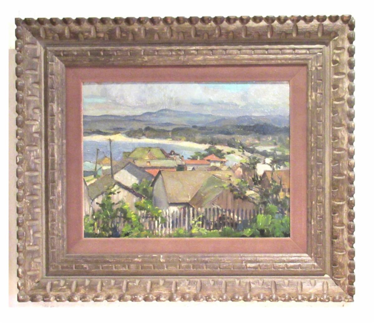 On May 31, 1921 Myron married fellow artist Dorothy Gertrude Welsh @ NYC’s 5th Avenue Presbyterian Church. Also from Mr. Edwards’s book one learns that “Myron applied for a honeymoon passport to travel in Europe and he was officially described as five feet ten and a half inches tall with blue eyes, brown hair, a mustache and a scar on his ‘pointed’ chin. When family matters detained his wife in the United States for six months, he decided to sketch with fellow artist Phillips Frisbie Lewis in Brittany. Thereafter the reunited Olivers purchased an old Red Cross ambulance and toured extensively through France, including Paris, St. Tropez and Nice, as well as Italy. While in Florence he studied frame making as well as the old methods of applying gesso and laying gold leaf.” Mrs. Oliver returned home in November 1922 & Myron in April the following year. Once reunited in Monterey, Myron continued painting & helped run the family’s shop. He became well known for his artistic frames (Jessie Arms Botke had him design & build custom frames for her larger canvases). He was a key craftsman for Effie Fortune’s Monterey Guild. A founding member of the Monterey History & Art Association, he also helped Frances Elkins restore & refurbish the town’s adobes.