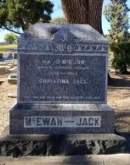 William Jack married twice, and had by his first wife five sons and a daughter, and by his second wife a son, David, and two girls: Margaret, who died in early childhood, and Christine of this review. David was born in 1826 (1822) attended the public school in his village, and at the age of seventeen (nineteen) crossed the ocean to New York, where he secured a position as a bookkeeper with the firm of Flood, Mackay & O’Brien. Six years later he made for California via Panama, and at Monterey again took up bookkeeping. He acquired some land and became a farmer and stockman, and soon owned several large tracts in various parts of Monterey County. He settled in Monterey, where he died at the ripe age of eighty years (86). Mr Jack married and was blessed with seven children, all of whom are living. In 1857 he was able to revisit Scotland and see his boyhood home. As a Presbyterian and a Republican he made his contribution to the bettering of both religious and political conditions in the country of his adoption.