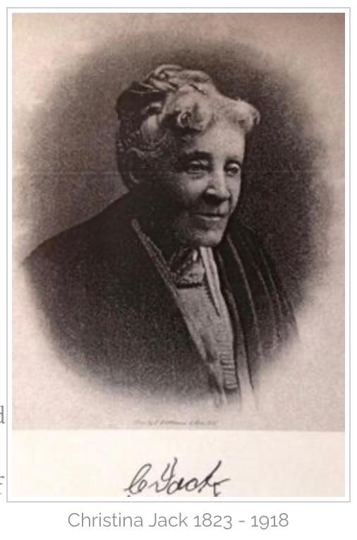 Just what a woman can do when she inherits the thrift of the Old World and Scotch (Scots) energetic sturdiness is shown in the interesting story of the life of Miss Christine Jack, particularly that part which has to do with her contribution towards making California history. She was born at Creiff (Crieff), Perthshire, Scotland, the daughter of William Jack, who first saw the light of day at Strathallan, in the same shire- a plain man, a dealer in wood, who died where he had lived, esteemed by all who knew him, bequeathing no doubt to his daughter, some of those personal characteristics which have contributed to make her so popular in Paso Robles, where she has long been a resident. Her mother was Janet McCune (McEwan), a native of the Scottish Highlands and a woman of rare attainments and worth.