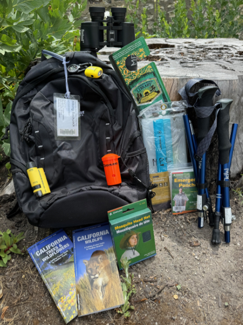 The library has nine hiking kits. Each kit includes a backpack, binoculars,