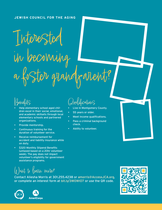 New! AmeriCorps Seniors Foster Grandparent Program. The AmeriCorps Seniors Foster Grandparent Program (FGP) is a recent addition to our volunteer community. The program provides social and academic support to elementary-aged children to promote school readiness. This program is open NOW with volunteers providing one-on-one support in local elementary schools and other host sites throughout the County. All FGP volunteers receive training, accident and liability insurance, meals on duty, transportation reimbursement, and a small hourly stipend. If you are interested, check the eligibility requirements and sign up by clicking here. To view the bilingual program flyer, click on the thumbnail picture above. If you have any questions, please contact Aliesha Morris at 301-225-4238 or amorris@accessjca.org.