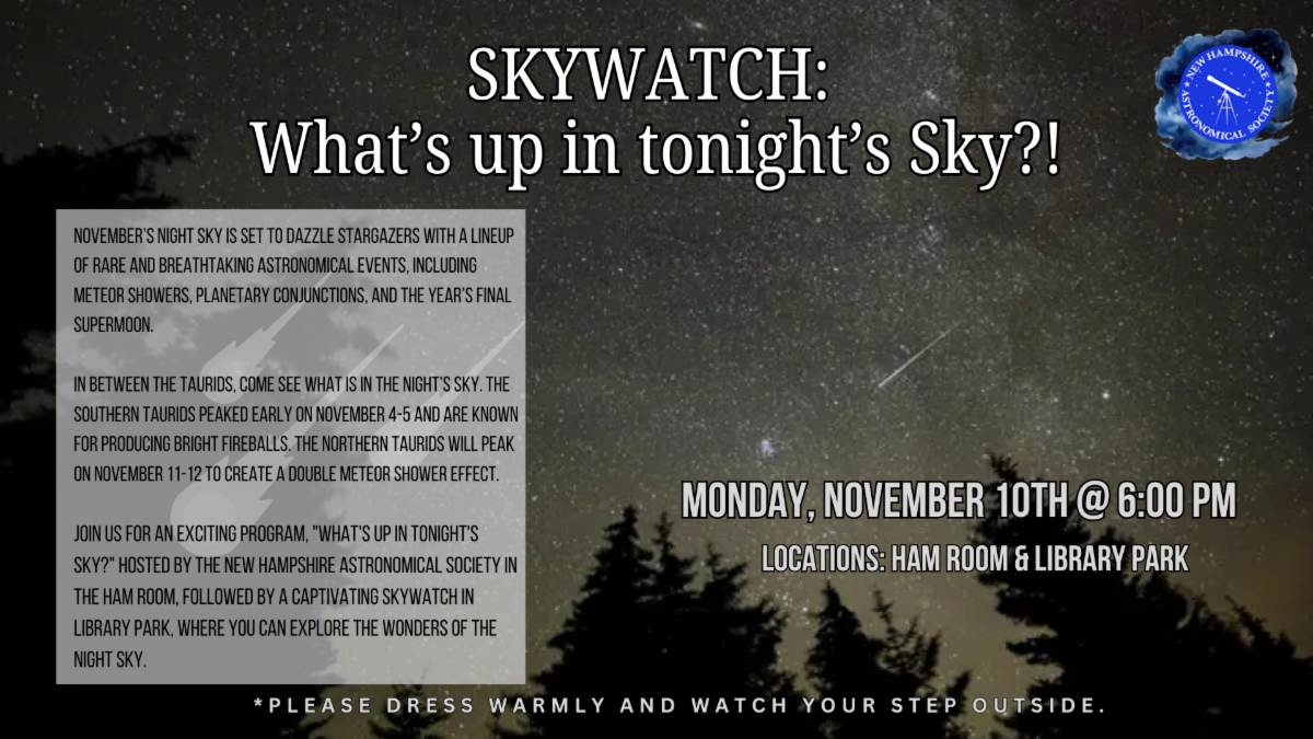 Join us for an exciting program, "What's up in Tonight's Sky?" hosted by the NH Astronomical Society in the Ham Room at 6:00 PM and followed by a captivating Skywatch in the library Park, where you can explore the wonders of the night sky. Don’t miss this opportunity to gaze through telescopes at various celestial objects!