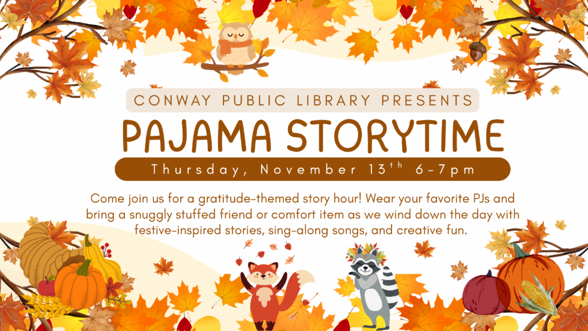 Embark on a unique journey with us for a special gratitude-themed story hour this Pajama Storytime, on November 13th at 6:00 pm. Slip into your favorite pajamas and bring along your snuggly stuffed friend or comfort item as we cozy up together for a heartwarming evening filled with stories that inspire appreciation, sing-along songs, and creative activities focused on gratefulness.