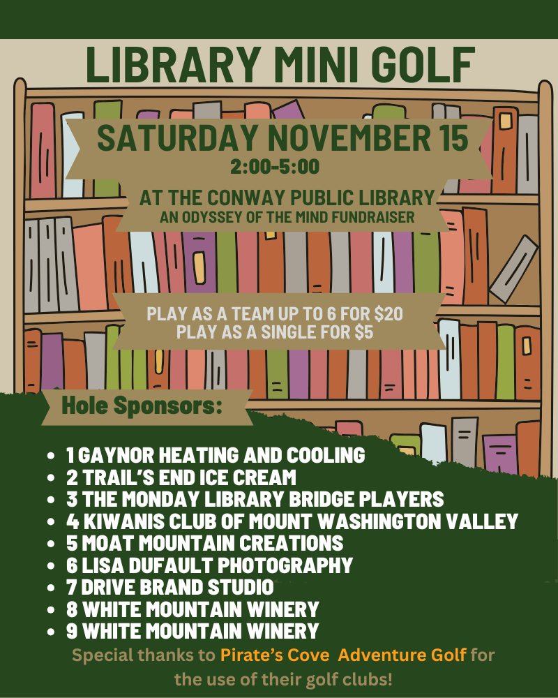 The Conway Public Library's Odyssey Teams will host a miniature golf event inside the library. Community members, OM participants, and families are all invited to come and play miniature golf for a fee. Proceeds from the event will support our teams' participation in the Maine OM Competition and provide the materials needed to tackle their long-term problems for the competition. The Odyssey of the Mind teams are putting the fun in fundraising!