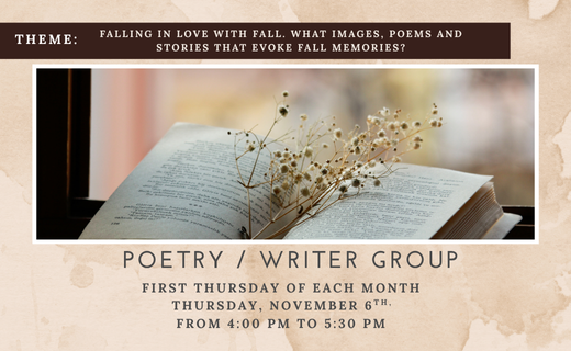 Join us for creativity and inspiration as we gather for monthly mini-workshops and five-minute readings. Bring your short stories and narratives to share or simply enjoy the talents of others. For November, the theme is "Falling in Love with Fall." What images, poems, and stories evoke Fall memories?