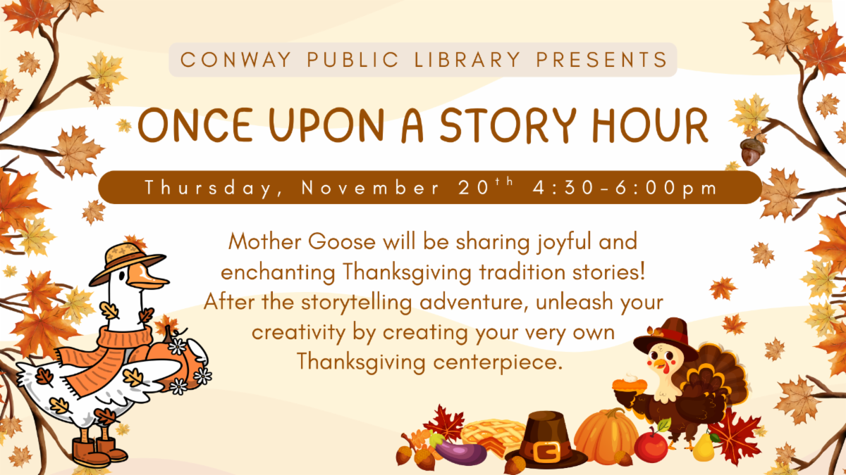 Join us for Once Upon A Story Hour on the last Thursday of each month at 4:30 pm in the Periodical Room. Mother Goose will share joyful, enchanting Thanksgiving-themed stories! All ages are welcome, but children under 10 must be accompanied by an adult. After the storytelling adventure, unleash your creativity by creating your very own Thanksgiving centerpiece.