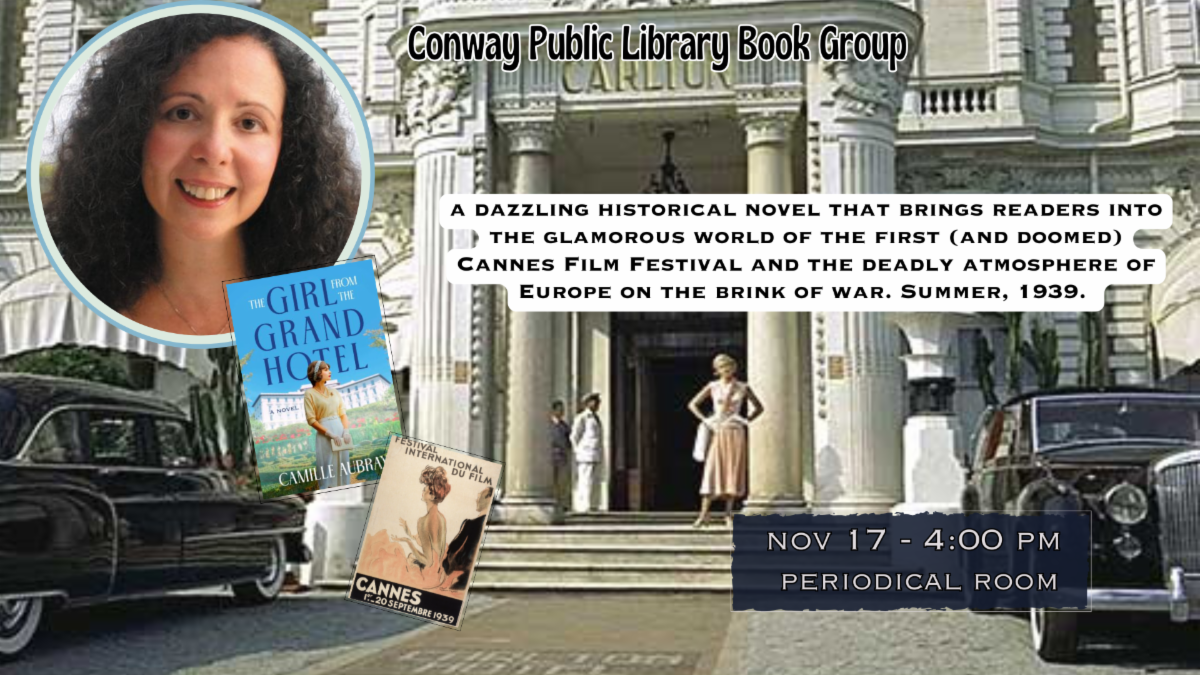 The book group normally meets on the third Monday of each month in the Periodical Room, except when the original date falls on a holiday. In November, the book pick will be "The Girl from the Grand Hotel" by Camille Aubray. Also in November, any suggestions for next year picks, please have them ready by the last book club meeting.