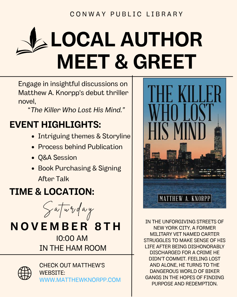 Join us for an engaging discussion on Matthew A. Knorpp's debut novel, "The Killer Who Lost His Mind," in the Ham Room at 10:00 AM.