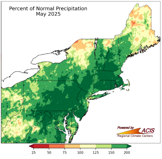 This map showing the percent of average May precipitation confirms that our wet spring was anything but average. The darker green areas received more than 1.25 times the May average. Most of Vermont received 150 percent of its average, and some regions even received 200 percent of their average. This excess rainfall delayed field work and made spring planting challenging for many farmers across the state. If you are struggling with wet conditions on your farm, contact us, and we may be able to help!