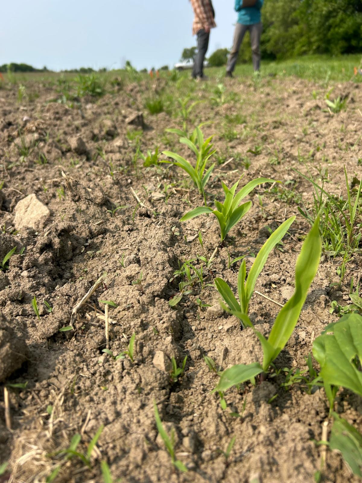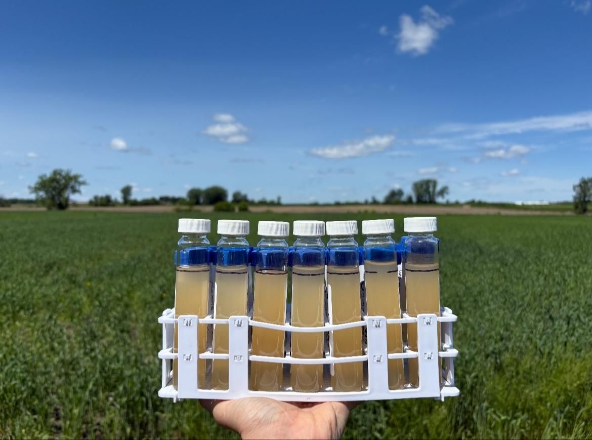 | | | Surface and subsurface runoff samples collected at the Discovery Acres research site to test for phosphorus and nitrogen concentrations in water leaving the agroecosystem. | | | Our team harvested this rye grass to collect biomass data and to assess weed presence within the plots. | | | We encountered challenges when planting black beans into crimped rye due to its excessively thick matting. In some cases, seeds were deposited on top of the rye rather than in the soil beneath it. | | | The team assessing corn emergence in the field. | | | |