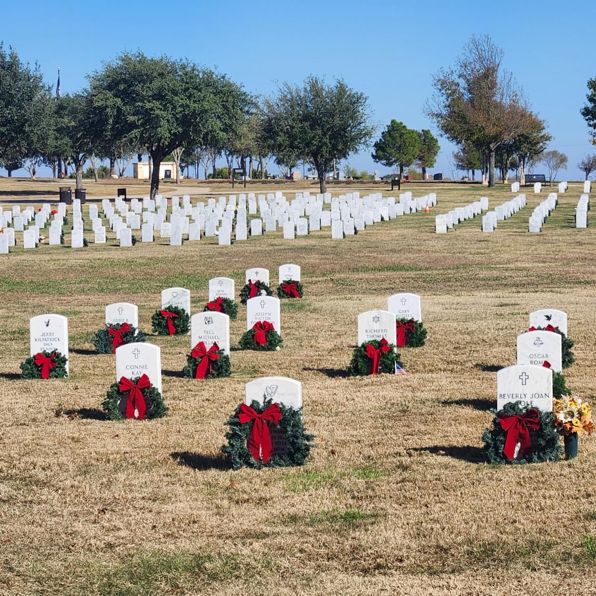 That was then... this is now! On Saturday, November 29th, 2025, more than 17,000 wreaths adorn the resting places of fallen soldiers and/or their spouses. The Shines are now training people in other states to do what we are doing here, in Central Texas. Recently, more land has been dedicated to extend the number of graves on the grounds of the Central Texas State Veterans Cemetery. Jean's goal is to provide a building where the wreaths can be stored, rather than using trucks. We can help.