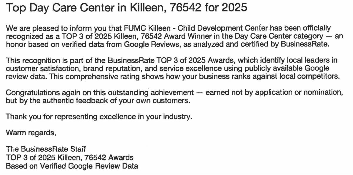 We are recognized by BusinessRate as one of the Top 3 Child Development Centers in Killeen. This rating is based on authentic feedback through Google Reviews online. Thank you to our CDC board, CDC staff, and parents. You are greatly appreciated!