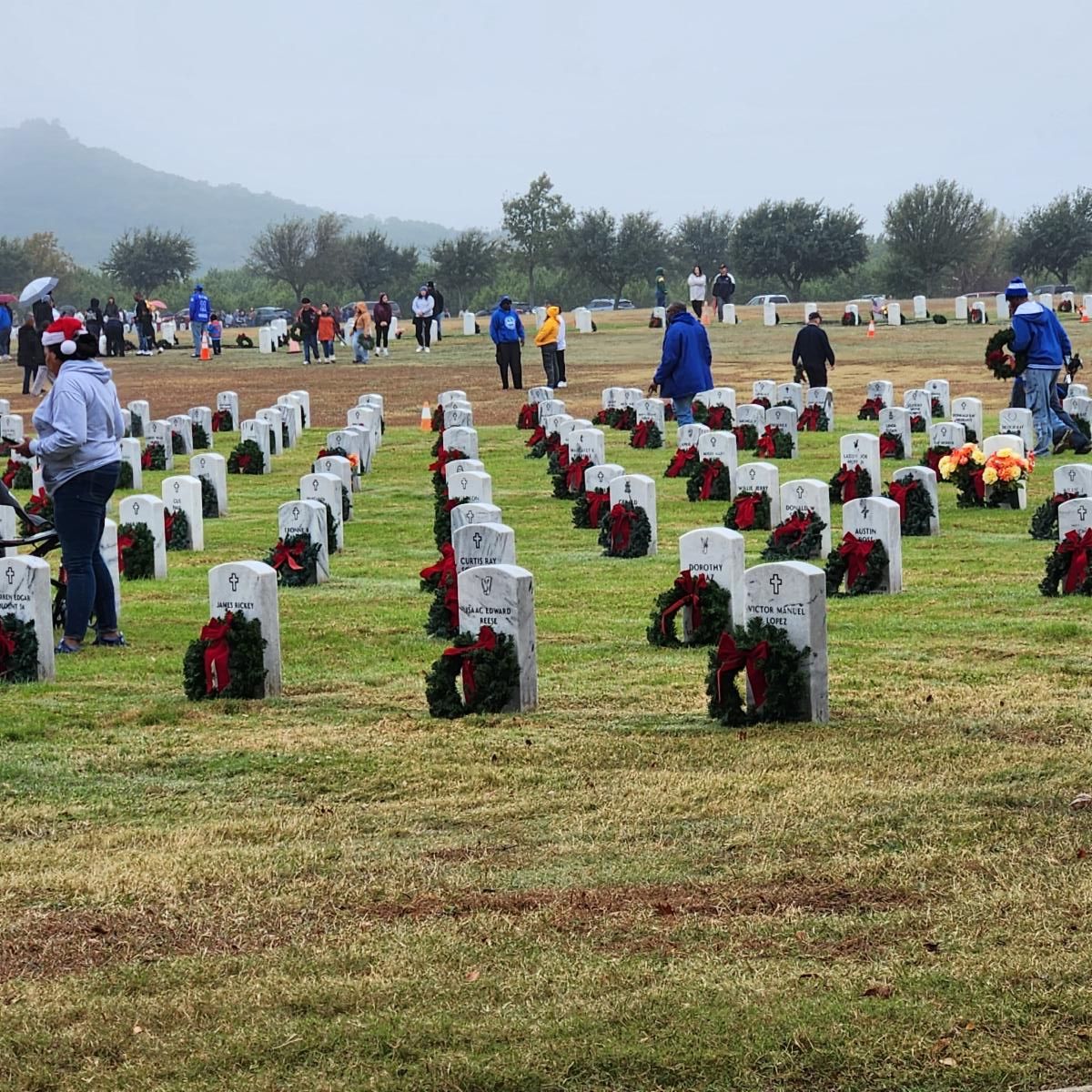 With 12 volunteers to help her that first year, Shine’s determination paid off with a wreath at every grave. The following year, she created the non-profit Friends of the Central Texas State Veterans Cemetery, which fundraises and organizes Wreaths for Vets. This year, hundreds of volunteers prepared the wreaths on Nov. 21 in preparation for Saturday’s wreath-laying. Despite the bad weather forecast Saturday morning, Shine estimated between 1,000 to 2,000 volunteers braved the elements to honor the fallen."