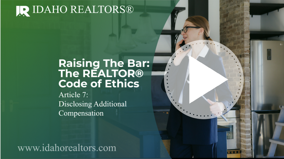 In this episode of “Raising the Bar: The REALTOR® Code of Ethics”, Idaho REALTORS® First Vice President Jennifer McCulloch discusses Article 7, which covers the requirement to disclose compensation from more than one party in a transaction.