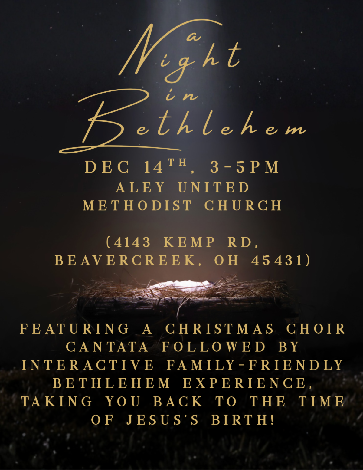 December 14 – Night in Bethlehem (and Choir Christmas Cantata) from 3:00 pm - 5:00 pm. There will be music, activities, games, food and a live nativity.
