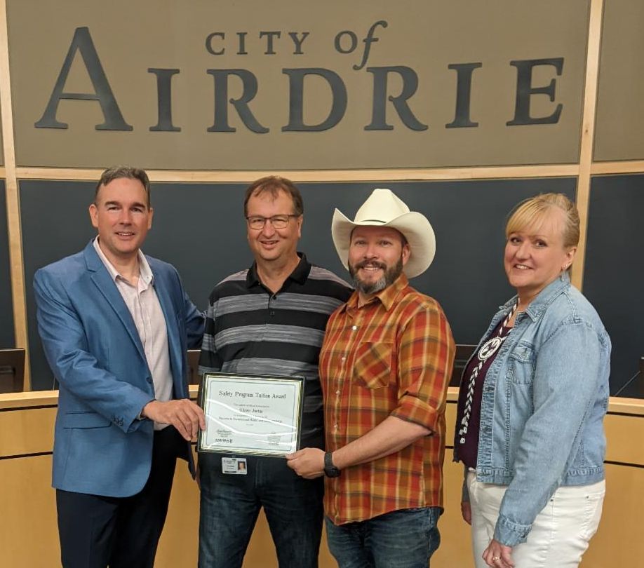 On behalf of AMHSA, Director Scott Lyall was proud to present the award to Shawn Justus, Team Leader Health, Safety & Security for the City of Airdrie. Thank you to Paul Schultz, CAO for the City of Airdrie, and Judy Molnar, HR Director for the City of Airdrie, for their participation in the award ceremony.