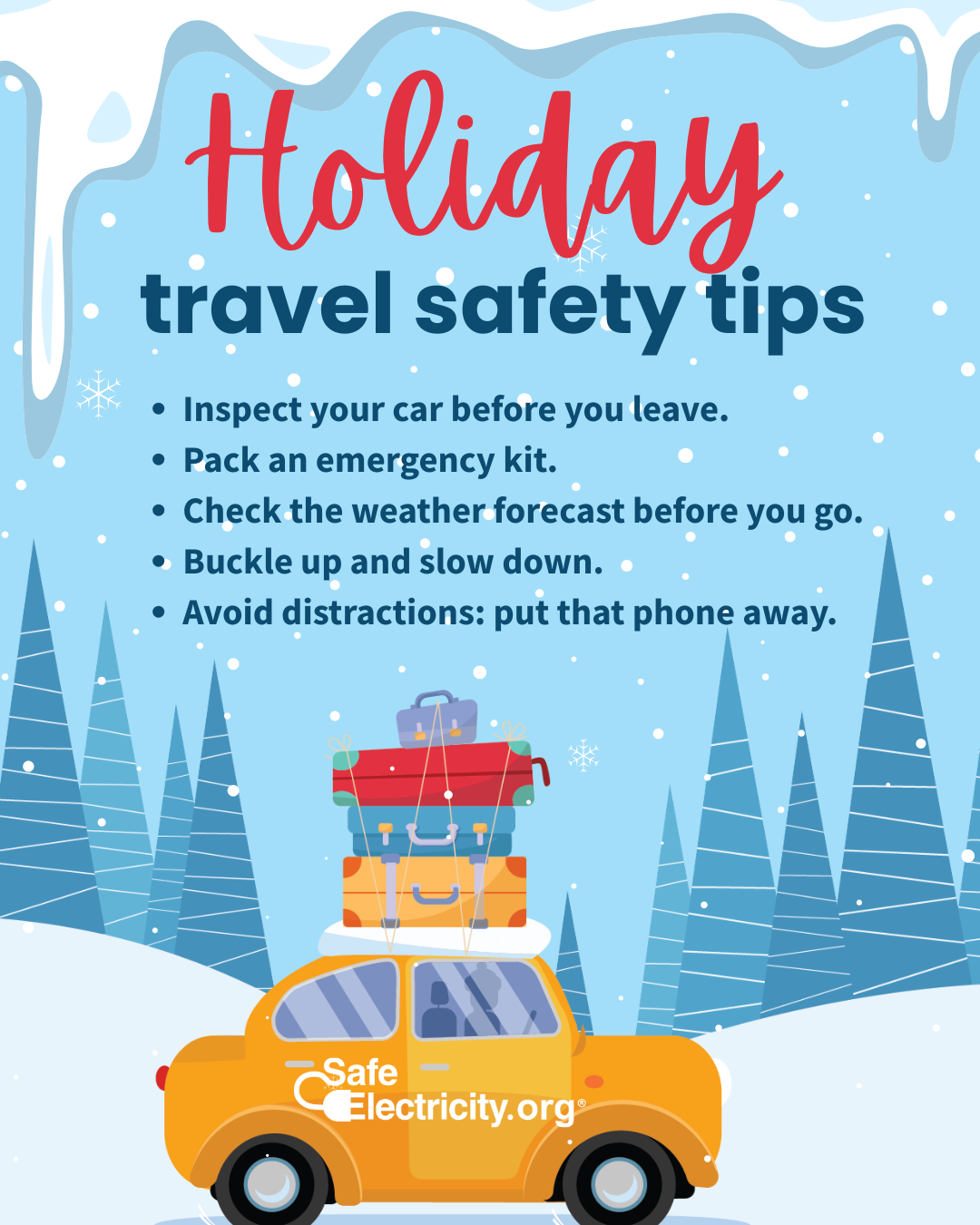 December's social media packageincludes images and sample posts on holiday tree safety, space heaters, fire safety, holiday travel, downed power lines, & holiday greetings.