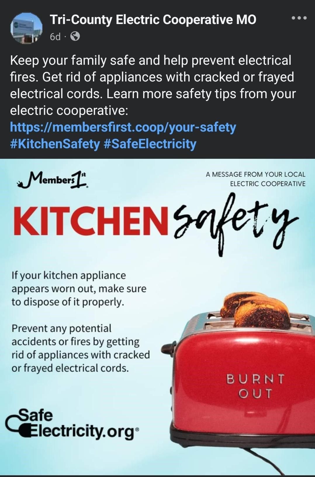 Kitchen Appliance Safety social media graphic, Tri-County Electric Cooperative, Mo.