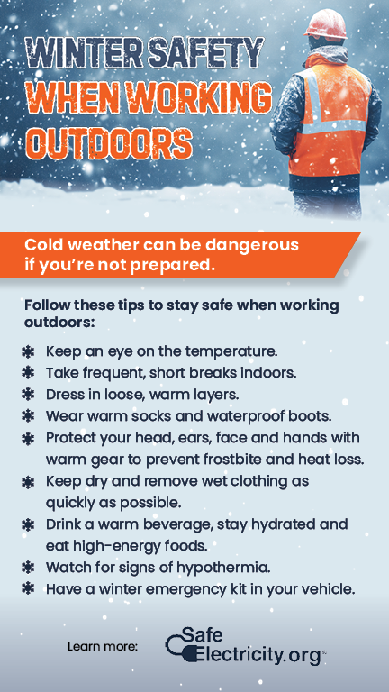 ❄️ Cold weather safety: Promote cold-weather safety for outdoor workers. Share ways to stay safe, post warning signs of hypothermia and display this internal safety poster to support your lineworker team.