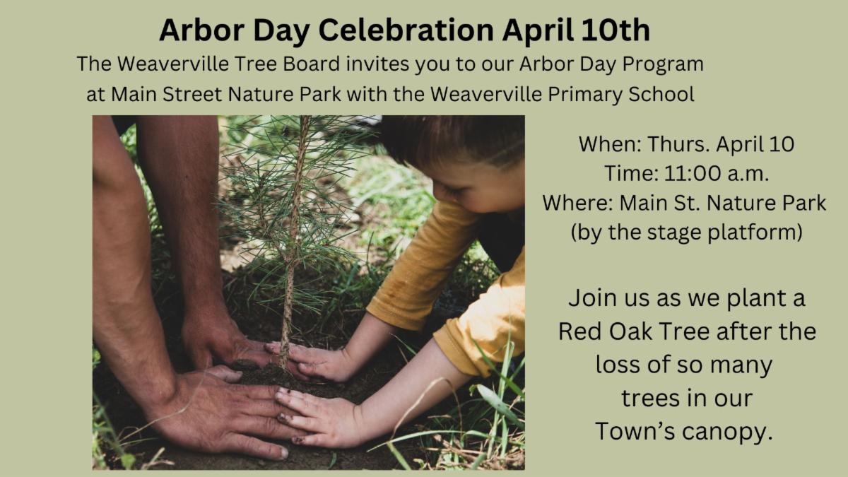 The Tree Board cordially invites you to join us on Thursday, April 10th at 11:00 a.m., as we re-plant our tree canopy. We will be planting a legacy Oak Tree. The initiative includes our Weaverville Primary School children who will take part in the event and will receive tree seedlings to support our educational program, fostering a connection to the land.