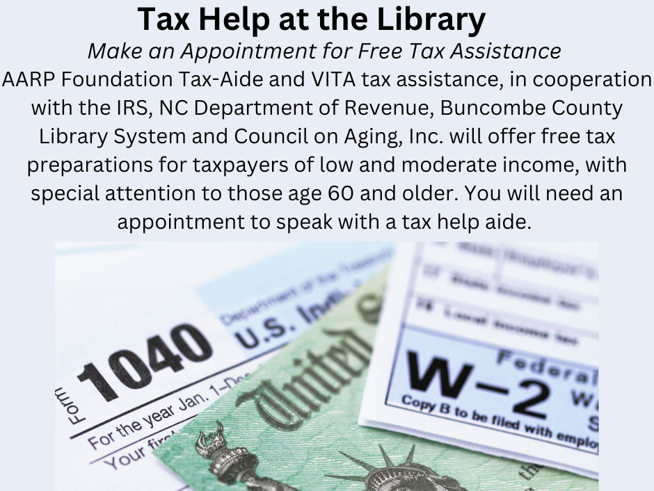 Make an Appointment for Free Tax Assistance AARP Foundation Tax-Aide and VITA tax assistance, in cooperation with the IRS, NC Department of Revenue, Buncombe County Library System and Council on Aging, Inc. will offer free tax preparations for taxpayers of low and moderate income, with special attention to those age 60 and older. You will need an appointment to speak with a tax help aide.