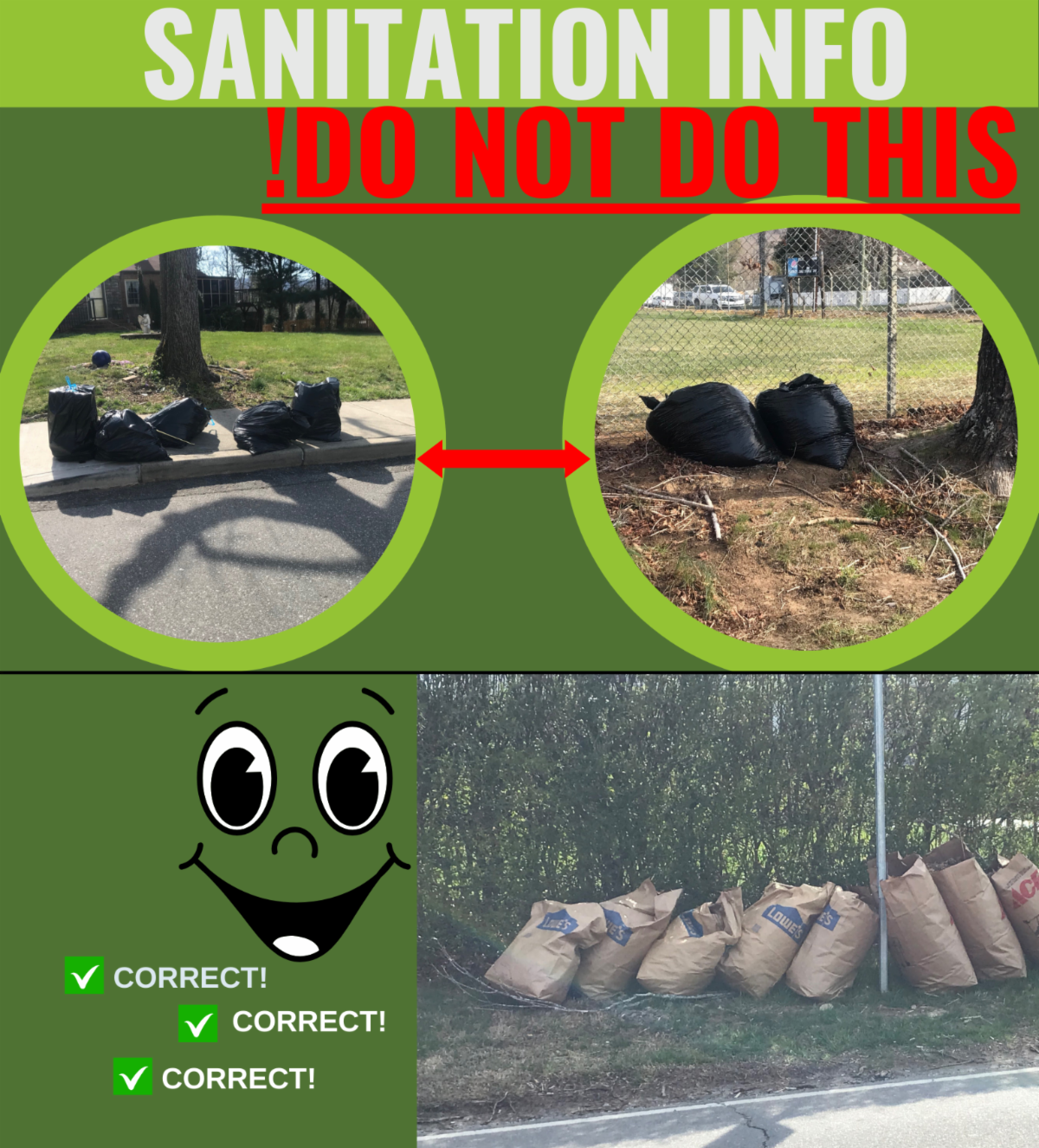 Rather than using black bags, residents can place small loose piles of yard debris at the curb or edge of the pavement for collection by our new grapple truck or placed in recyclable brown paper bags. Regular garbage (including black bags) placed within the green toter cans will be picked up; however, black bags stacked on top of the toter or left on the ground will not be picked up. The brown bags and the pile of yard debris are collected during brush week’s brush route.