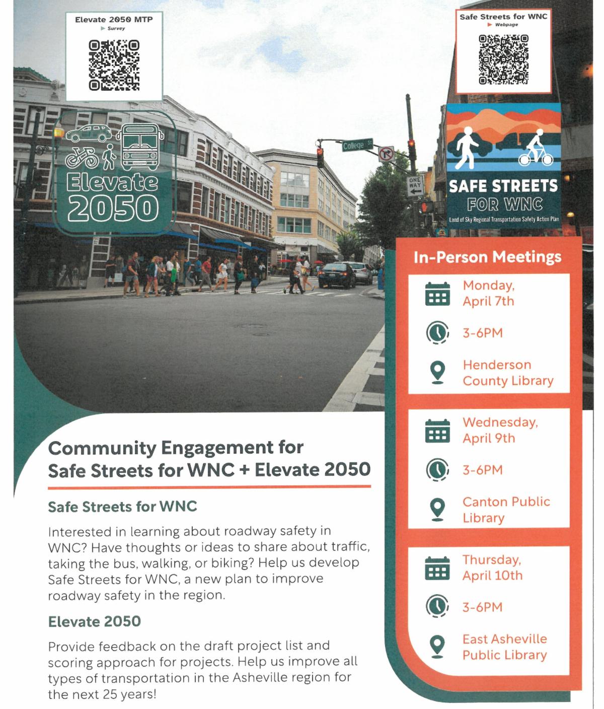 Safe Streets for WNC- a five-county plan that examines high-crash locations across the region and develops strategies to reduce crashes and fatalities on our region's roads for drivers, motorcyclists, pedestrians, bicyclists- everyone. We want to reduce the number of people being harmed on our roads- please come out to one of the meetings to learn more. More information on Safe Streets for WNC is available here: https://frenchbroadrivermpo.org/safe-streets-for-wnc-regional-safety-action-plan/