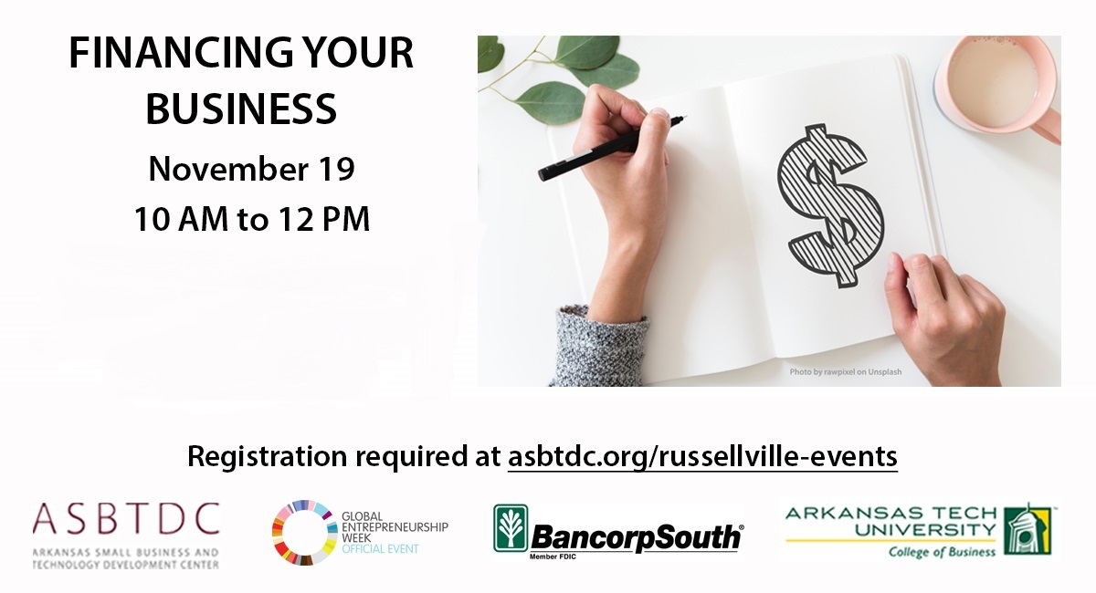 In celebration of Global Entrepreneurship Week, the Arkansas Small Business and Technology Development Center presents “Financing Your Business” on Nov. 19, from 10:00 a.m. to 12:00 p.m. at the Fort Smith Regional Chamber of Commerce. If you need money for your business, join us as we explore different sources of capital including loans, grants, and alternative financing options. Also hear from a lender who will discuss topics pertaining to achieving credit readiness. There is no charge to attend thanks to BancorpSouth. Seating is limited with registration required no later than Nov. 18, at 479-356-2067 or asbtdc.org/russellville-events.