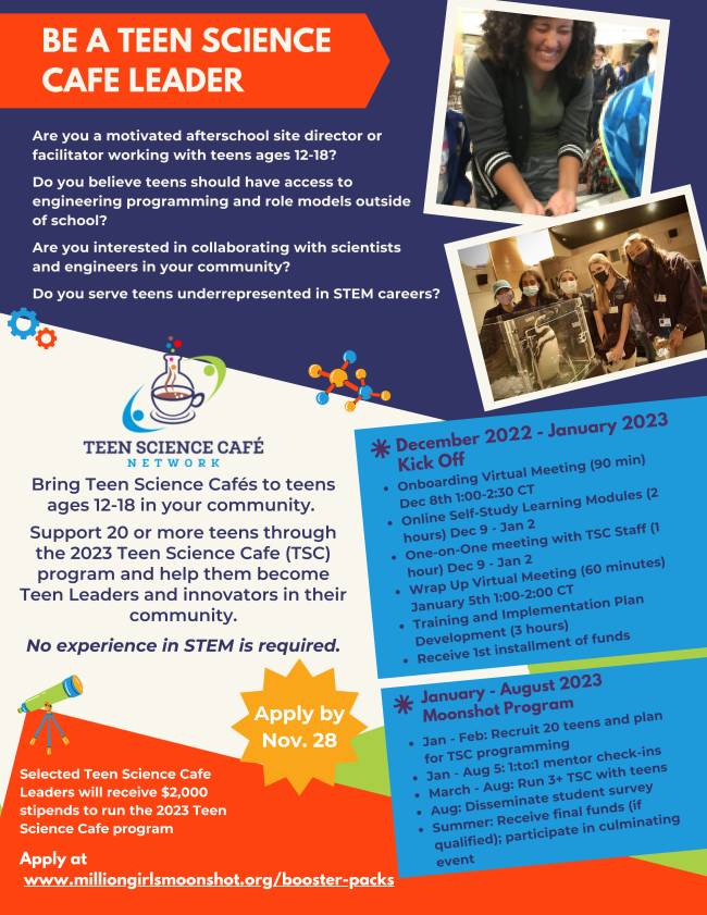 Are you a motivated afterschool site director, specialist, or facilitator already working with teens ages 12-18? Do you serve teens who are underrepresented in STEM careers? Are you interested in collaborating with scientists and engineers in your community?