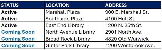 By utilizing fatal and nonfatal overdose data in the city and direct community input, the Opioid and Substance Use Response Team (OOSUR) has identified the North Avenue, Broad Rock, and Ginter Park libraries as the new homes for these machines. Libraries already function as central hubs for our community, providing resource connection, care, and support. This intentional partnership allows for the unique integration of harm reduction supplies in welcoming and accessible spaces. These sites were selected to ensure that life-saving resources are embedded directly within the neighborhoods that need them most.