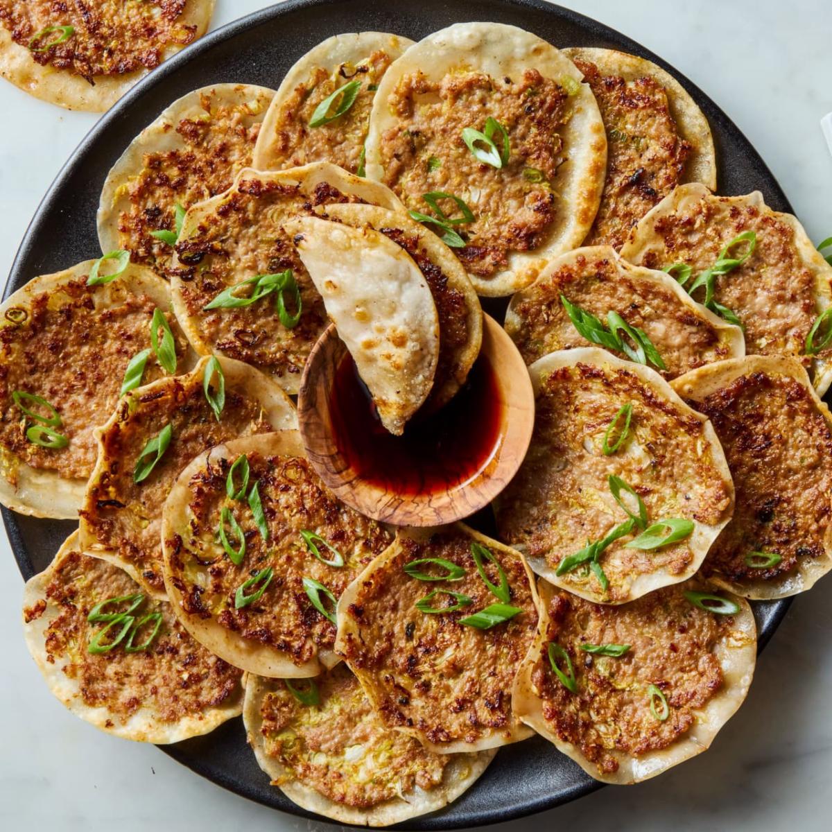 Finely slice the scallions and cilantro, then add most of it (keep aside a little to top your tacos with at the end) to a mixing bowl along with the ground pork, crushed garlic, grated ginger, 2 tablespoons of soy sauce, 1 tablespoon of sesame oil, 2 teaspoons of fish sauce, 1 tablespoon of black vinegar and a good grind of black pepper. Mix to combine, making sure all the seasoning is evenly spread throughout the pork. Spoon a couple of tablespoons of the pork filling onto each mini tortilla, and use a spoon to press the mixture into a thin layer, ideally filling up one side of the tortilla. et a large frying pan or skillet over medium-high heat, and add a drizzle of olive oil. Place the topped tortillas, dumpling mixture down, onto the pan and press the tortilla into the pan. Cook for four minutes, then flip the tacos and cook for another minute, just to crisp up the tortilla. Remove from the pan, then repeat with the rest of the tortillas.