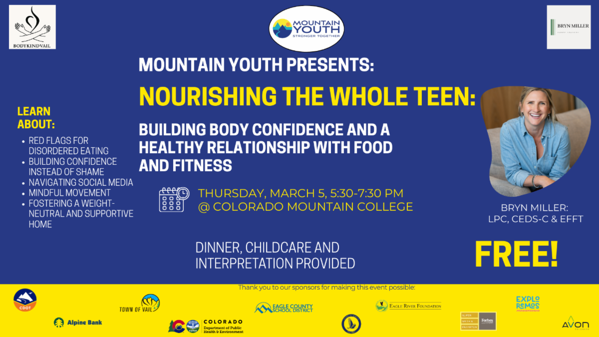 | | | En un mundo de filtros de redes sociales y consejos de salud contradictorios, ayudar a su hijo adolescente a sentirse seguro en su propia piel puede sentirse como una batalla cuesta arriba. Acompáñanos en una sesión de empoderamiento en la que cambiamos el enfoque de "hacer dieta" a "nutrir", dándole las herramientas para fomentar una imagen corporal positiva y una relación alegre con el ejercicio. Usted se marchará con la "conciencia protectora" para detectar las primeras banderas rojas de trastornos de la conducta alimentaria , junto con estrategias prácticas para convertir su hogar en un santuario para la autoestima y la resiliencia emocional. | | | Mountain Youth se complace en ofrecer Pilates GRATIS todos los miércoles de marzo de 6:00 a 7:00 pm en Gypsum Rec Center. Las clases serán ofrecidas por nuestra instructora local, Lauren Bumgarner. ¡Únete a nosotros para noches de ejercicio y conexión! | | | Join us for the We Hear U program—a supportive, engaging class designed to help families strengthen their skills in setting boundaries, improving communication, and using natural consequences effectively. With summer just around the corner, it's the perfect time to gain tools and confidence for a smoother, more connected season with your kids. | | Únase a nosotros para el programa We Heart U, una clase de apoyo y atractiva diseñada para ayudar a las familias a fortalecer sus habilidades para establecer límites, mejorar la comunicación y usar las consecuencias naturales de manera efectiva. Con el verano a la vuelta de la esquina, es el momento perfecto para ganar herramientas y confianza para una temporada más suave y conectada con sus hijos. | | |