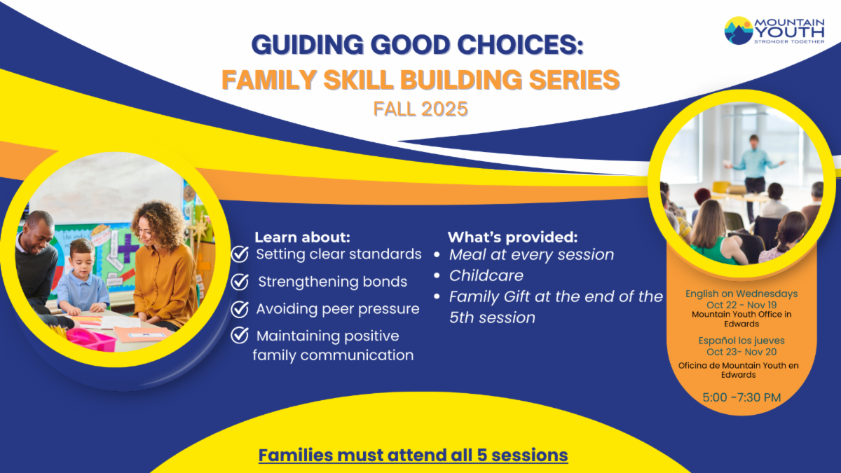 Únase a Mountain Youth en Edwards Early Learning Center todos los miercoles entre el 19 de marzo al 16 de abril para la capacitación Guiding Good Choices.