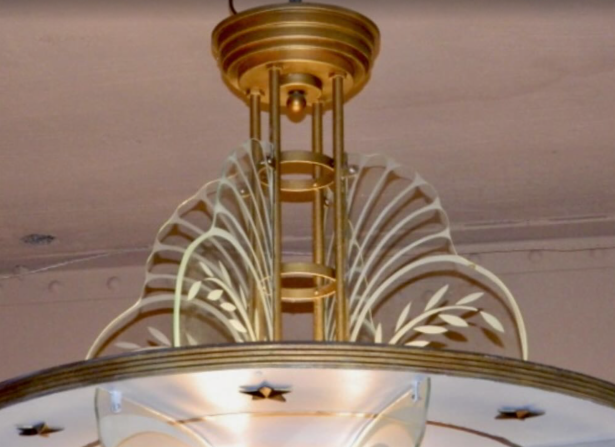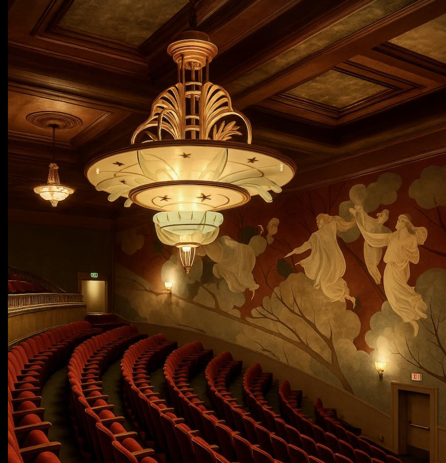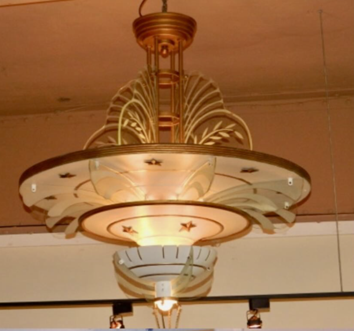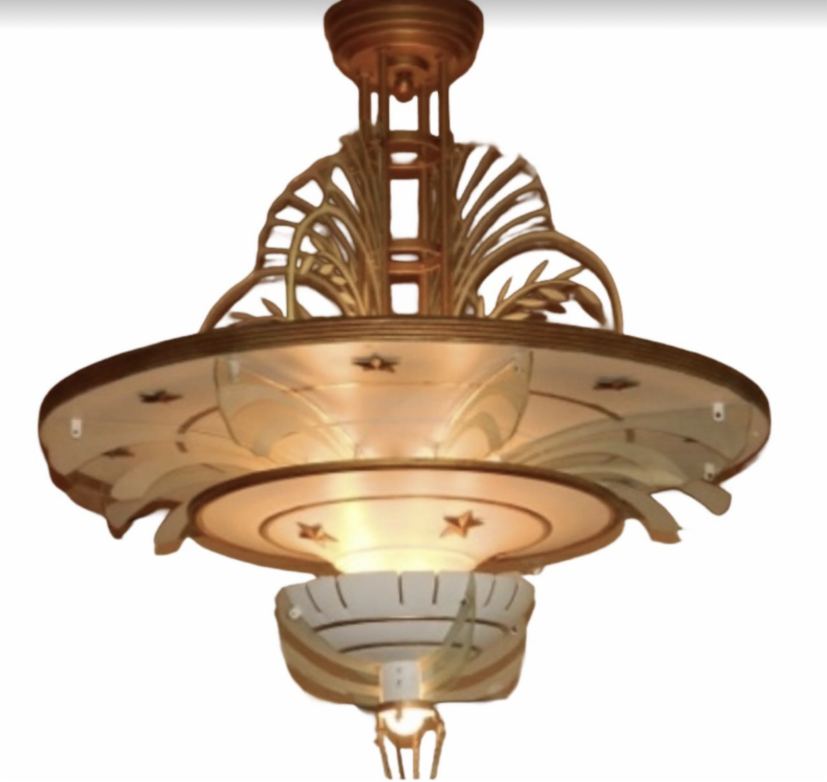 This pair of chandeliers, removed from the historic Metro Theatre on Union Street in San Francisco, represents a unique chance to acquire original fixtures connected to the city’s golden era of movie palaces. The Metro Theatre, first built in 1924 by Samuel Levin, was dramatically redesigned in 1941 by Otto Deichmann and Timothy Pflueger, two of the Bay Area’s most important architects and designers of the period. Both were central figures in the 1939 Golden Gate International Exposition on Treasure Island, even appearing together in Diego Rivera’s celebrated mural created for the fair.