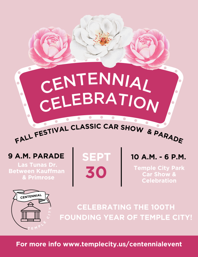 The City of Temple City, Temple City Unified School District, and the Historical Society of Temple City cordially invite you to celebrate our town's 100th (Centennial) founding year in a day filled with fun, activities, performances, and lots of Camellia pride!