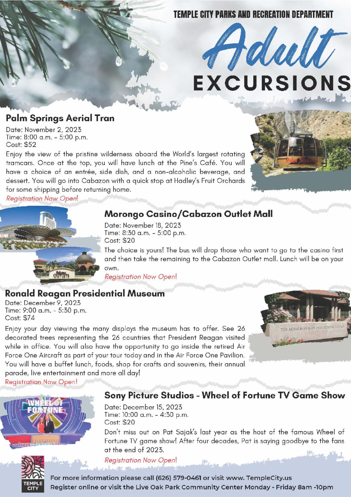 Register for the upcoming Adult Excursion trips! For more information, please call the Parks and Recreation Department at (626) 579-0461. To register for a trip, please visit the Live Oak Park Community Center Monday - Sunday, 8:00 a.m. - 10:00 p.m.