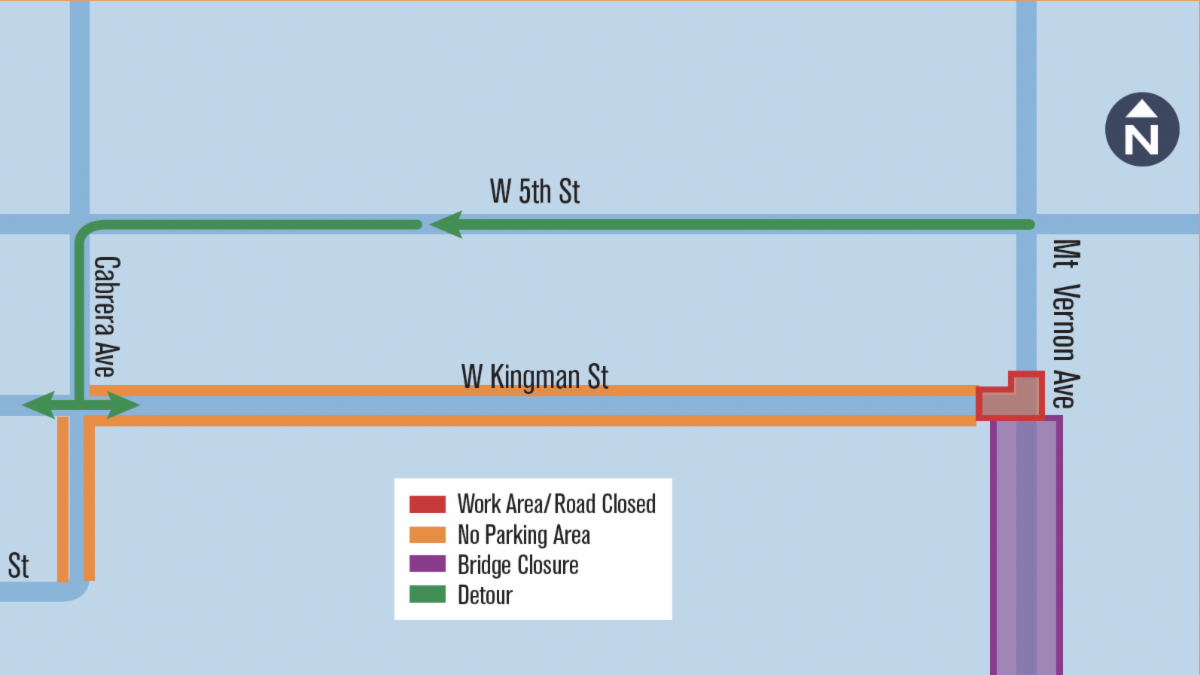 WHAT’S HAPPENING: The Mt. Vernon Avenue Bridge project is nearing completion, with the bridge set to open in late-August. As part of the remaining improvements, crews will reconstruct Kingman Street to widen it, install new pavement and add a new curb and sidewalk along the south side of the street.