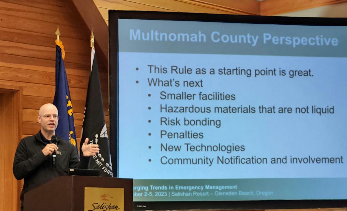 On October 4th, MCEM Director, Chris Voss, spoke as part of a panel at the Oregon Emergency Management Association's annual members' conference on the Department of Environmental Quality rulemaking for the new seismic mitigation program for the Critical Energy Infrastructure Hub in Multnomah County. Voss briefed the audience of emergency managers and partners on the County's perspective.